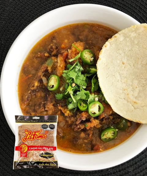- Agrega la carne seca al sartén y guisa hasta que agarre color